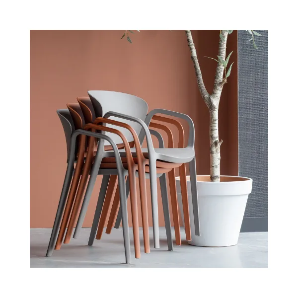 The Bent dining chair is a real eye-catcher in the dining area. The Bent dining chair is made of plastic in an attractive terra colour. Extra handy, Bent is stackable and therefore easy to store! To protect hard floors indoors, place felt glides under the legs. The Bent dining chair has a maximum capacity of 120 kg and is delivered assembled. The synthetic dining chair is easy to keep clean with a slightly damp, clean cloth.
