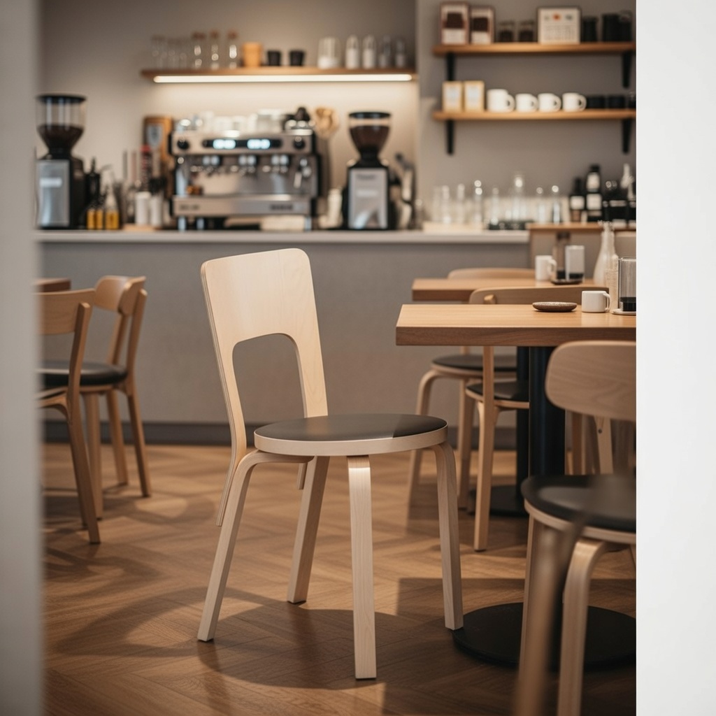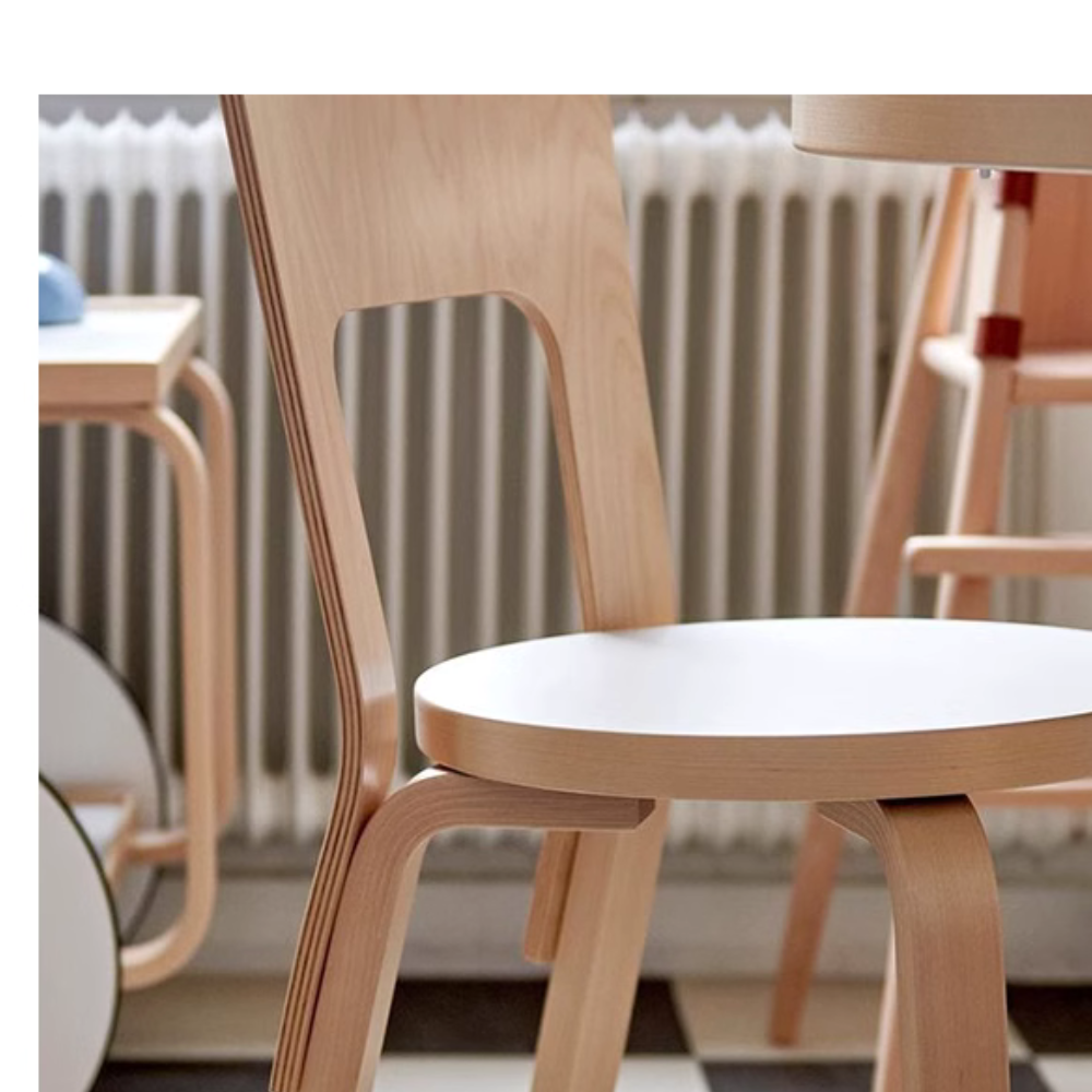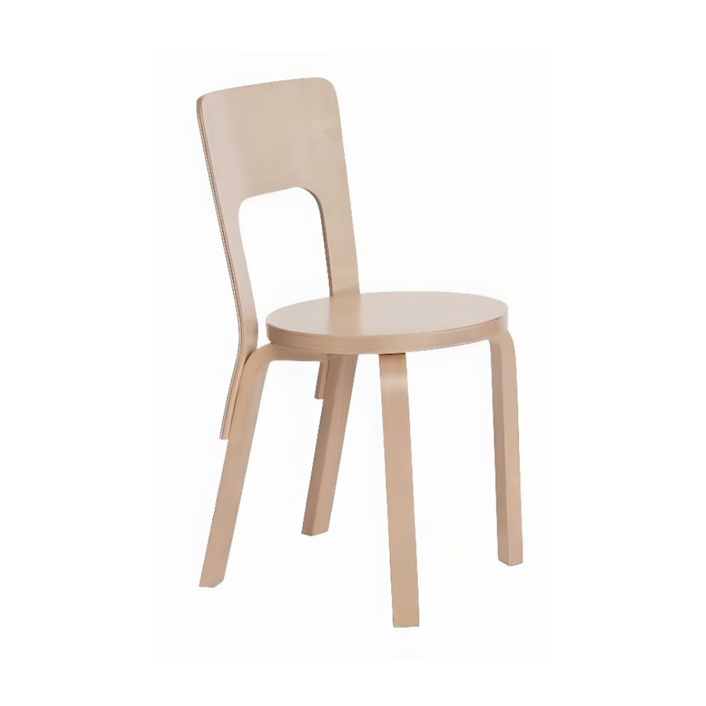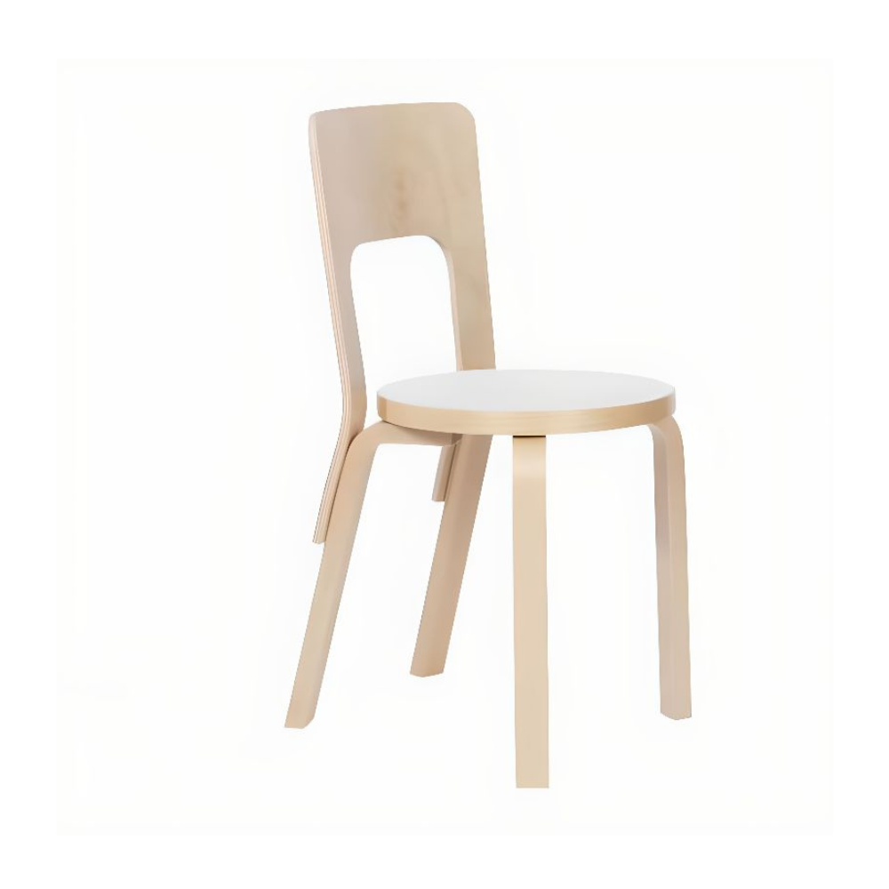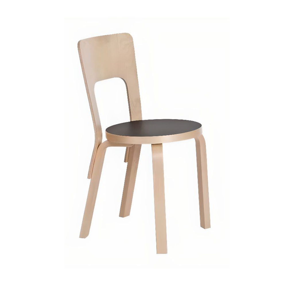 Chair 66 is a universal wooden chair in the tradition of classic kitchen and café chairs, its visible, additive construction logic is full of character and pleasing to the eye. The wide backrest offers comfort and flexibility, while the Finnish birch used to make the chair is both durable and lightweight. With its handle-like seat back, Chair 66 is easy to move wherever it is needed. Legs Birch, Natural Lacquered Back Birch, Bent Plywood, Natural Lacquered Seat, Plywood with Black HPL