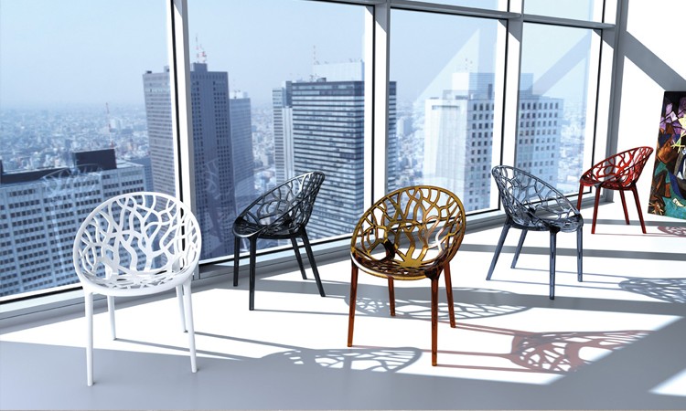 Stacking armchair for indoor and outdoor use in clear polycarbonate moulded with gas technology of the second generation. Scratch resistant, UV - resistant.