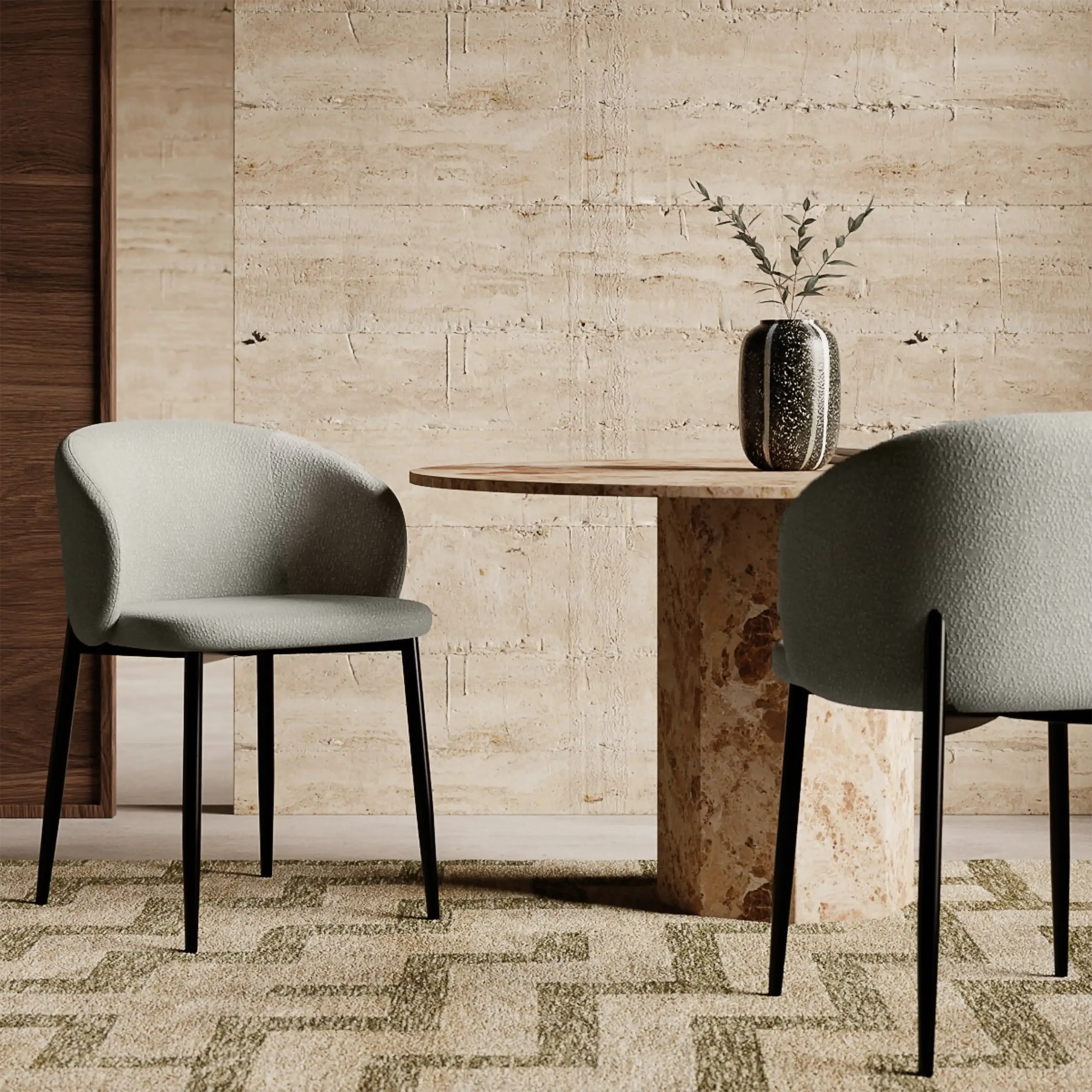 Our Gia Fabric Dining Chair is elegant and sophisticated, the ultimate contemporary choice for your dining room setting. This sturdy yet chic design features soft fabric upholstery on the seat and a wide curved backrest in a blend of greys. The black legs are tapered for a comfortable, sturdy, and modern style. This curved dining chair with sloping armrests is ideal for minimalist and Scandic-inspired interiors