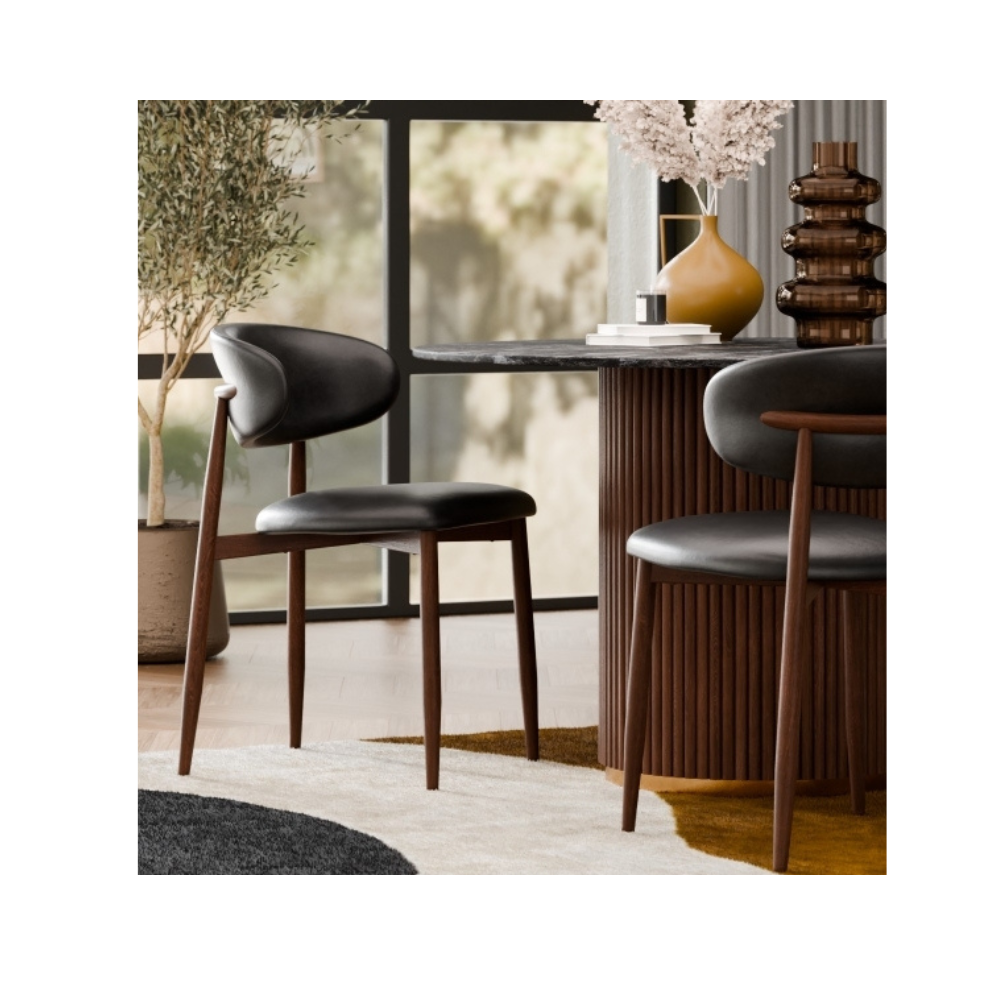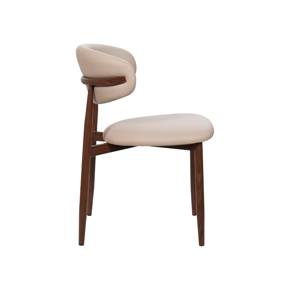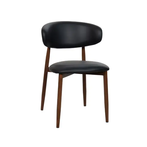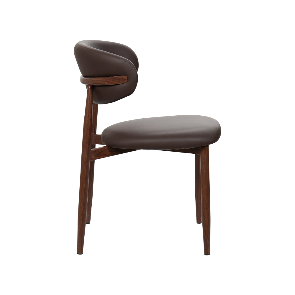 The harmonious blend of Nordic and Mid-Century in the Lucien Dining Chair makes it an irresistible option for kitchen and dining spaces. The curved metal frame has a walnut wood finish and is cross-fixed, making the Lucien durable and long-lasting for a high quality finish built to last. Crafted for comfort, the seat is upholstered in soft faux leather