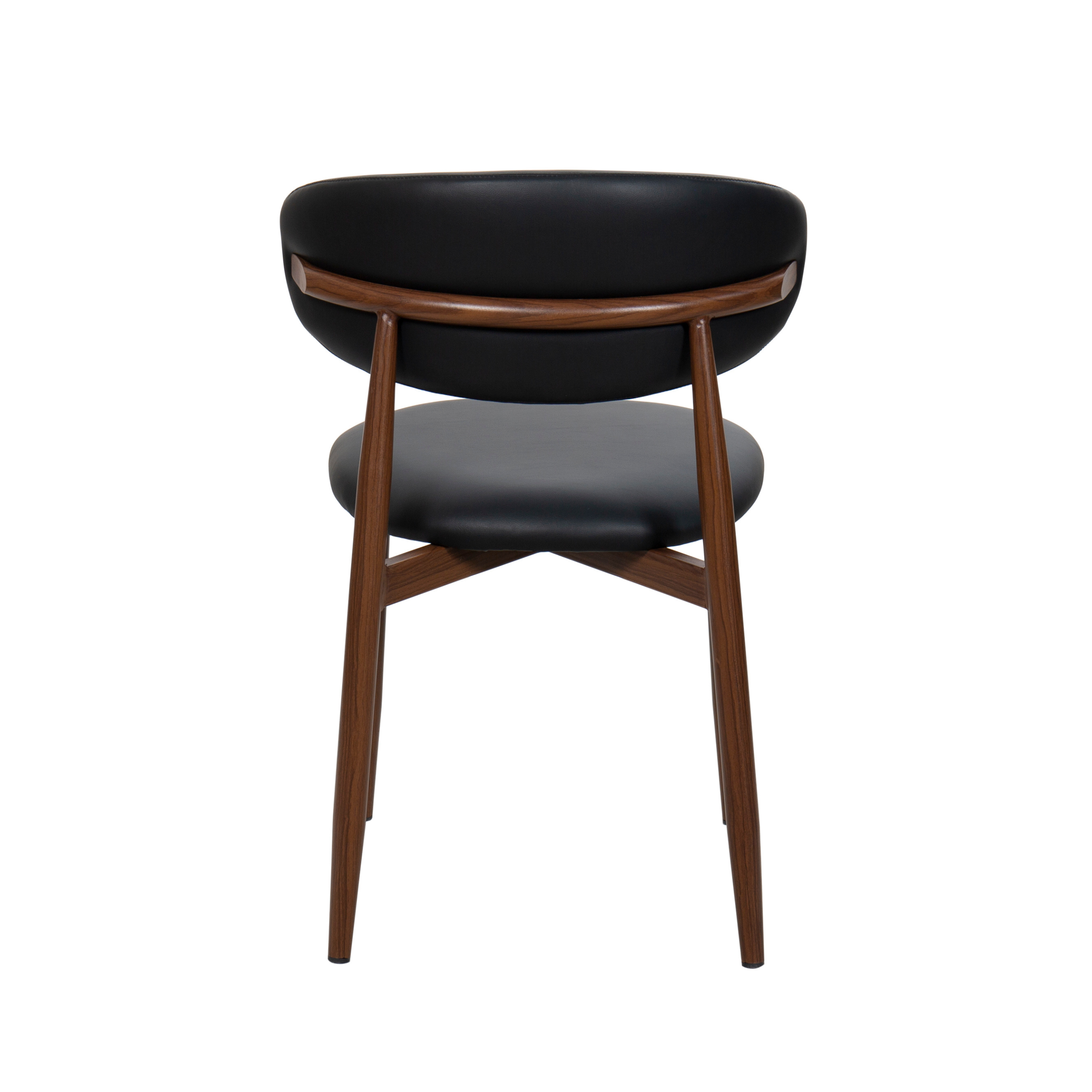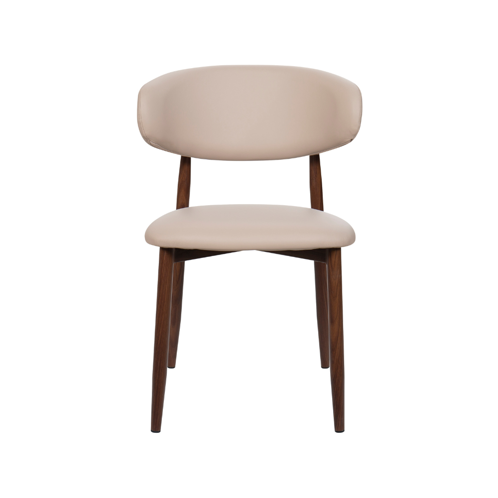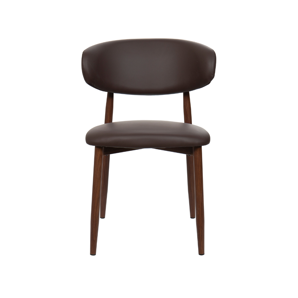 The harmonious blend of Nordic and Mid-Century in the Lucien Dining Chair makes it an irresistible option for kitchen and dining spaces. The curved metal frame has a walnut wood finish and is cross-fixed, making the Lucien durable and long-lasting for a high quality finish built to last. Crafted for comfort, the seat is upholstered in soft faux leather