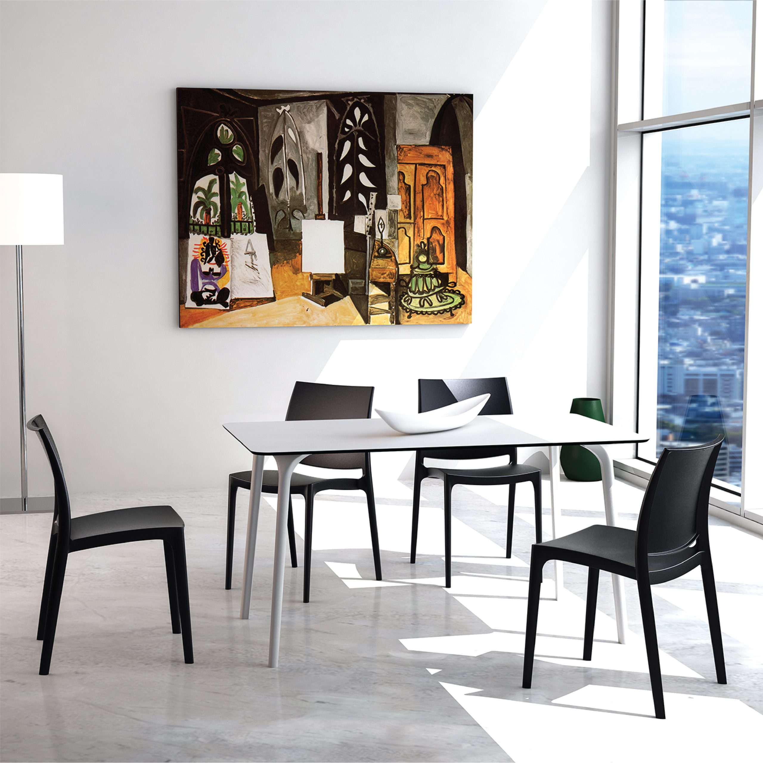 HPL compact laminated tops 12 mm with the latest generation of air moulding thermoplastic legs. For indoor and outdoor use. Can be dissambled.