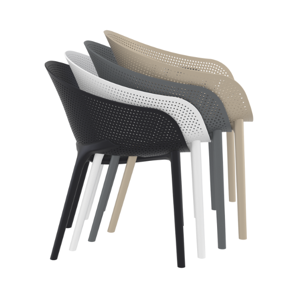 Sky Pro stacking armchair is produced with a single injection of polypropylene reinforced with glass fiber obtained by means of the latest generation of air moulding technology with neutral tones. For indoor and outdoor use.